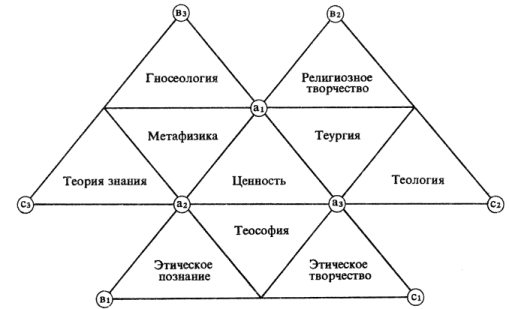 Белый не отрицает своих связей с философскими учениями предшественников, но предлагает глубже взглядеться в их природу: «Не прикрепляйте меня вы, прикрепители, объяснители, популяризаторы, – всецело: к Соловьеву, или к Ницше, или к кому бы то ни было; я не отказываюсь от них в том, в чем я учился у них; но сливать “мой символизм” с какой-нибудь метафизикой – верх глупости…» Отмечая, что он «ни шопенгауэрианец, ни соловьист, ни ницшеанец, менее всего “ист” и “анец”», Белый так характеризовал свое мировоззрение: «…оно ни монизм, ни дуализм, ни плюрализм, а плюро-дуо-монизм, то есть пространственная фигура, имеющая одну вершину, многие основания и явно совмещающая в проблеме имманентности антиномию дуализма, – но преодоленного в конкретный монизм»[34].