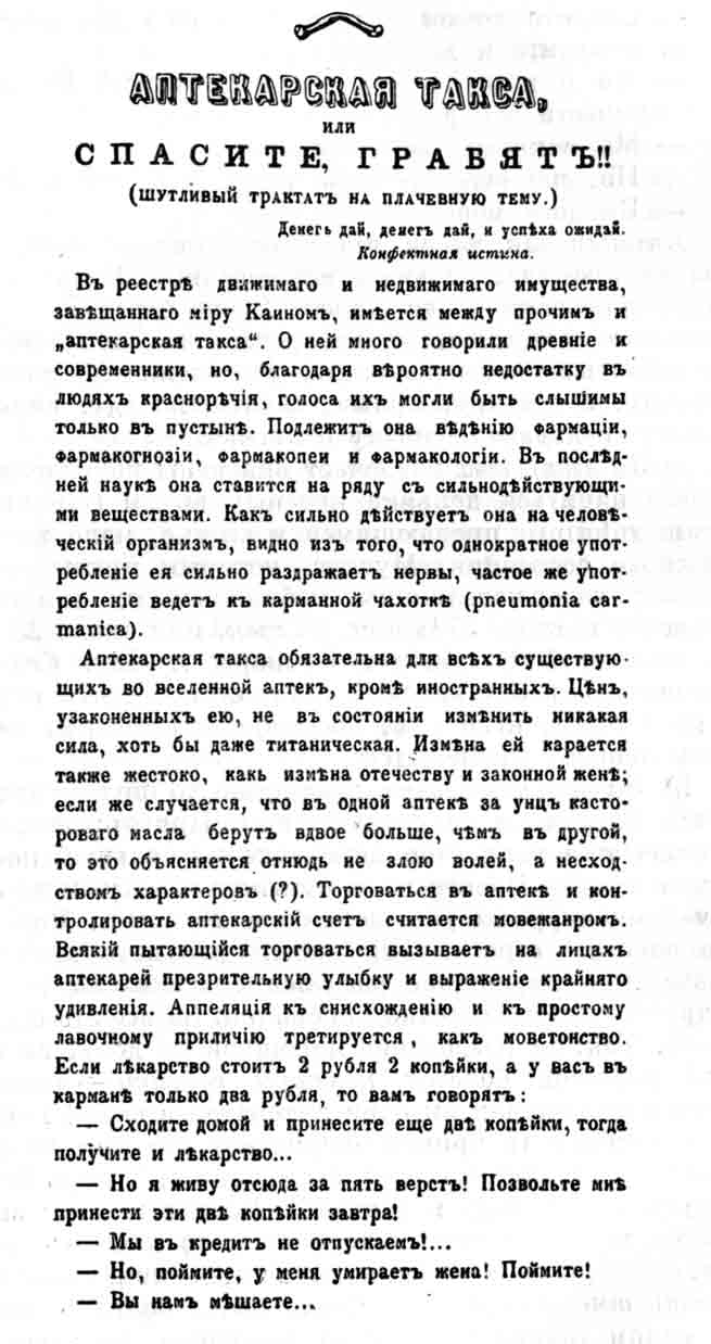 Пойдемте, читатель, вместе в театр, и вы увидите, что мы увидели. Пойдемте… ну хоть на «Adrienne Lecouvreur». Идем в восьмом часу. Приближаемся к театру и видим бесчисленное множество двуглазых тарахтящих карет, извозчиков, жандармов, городовых… Ряд гуськом возвращающихся от театра извозчиков буквально бесконечен. Съезд – размеров ужасающих. В театральных коридорах толкотня: московские лакеи налицо все до единого. Одежд не вешают, а, за неимением крючков на вешалках, складывают их вчетверо, сжимают и кладут одно платье на другое, как кирпичи. Входим в самую суть. Начиная с оркестра и кончая райком, роится, лепится и мелькает такая масса всевозможных голов, плеч, рук, что вы невольно спрашиваете себя: «Неужели в России так много людей? Батюшки!» Вы глядите на публику, и мысль о мухах на обмазанном медом столе так и лезет в вашу голову. В ложах давка: на стуле сидят papa, на коленях papa – maman, а на коленях последней – детвора; стул же в ложе не один. Публика, надо вам сказать, не совсем обыкновенная. Среди театральных завсегдатаев, любителей и ценителей вы увидите немало таких господ, которые решительно никогда не бывают в театре. Вы найдете здесь сухих холериков, состоящих из одних только сухожилий, докторов медицины, ложащихся спать не раньше не позже 11 часов. Тут и до чертиков серьезный магистр дифференциального вычисления, не знающий, что значит афиша и какая разница между цирком Саломонского и Большим театром… Здесь и все те серьезнейшие, умнейшие дельцы, которые в интимных беседах театр величают чепухой, а актеров дармоедами. В одной из лож заседает старушка, разбитая параличом, со своим мужем, глухим и гугнивым князьком, бывшим в театре в последний раз в 1848 году. Все в сборе…
