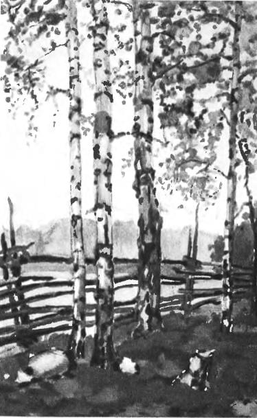 Вот широкое поле, и сыро и тихо еще в нем. А вот уже солнце стало подниматься. Ранний восход, птички зачирикали, и вот издалека, из тумана, показался поезд. Все ближе и все громче стучат колеса. Гудок… И колокол ударил на станции. Мама с папой в это время выходили на кухню. Коля не заметил, как они вернулись и стали в дверях.