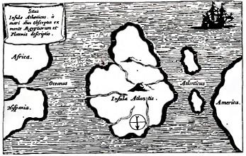 Рис. 1. Карта Атлантиды из «Мундус-Субтераунео» Р. А. Кихеда, Амстердам, 1665 г. Некоторые исследователи перемещают Атлантиду Платона из океана в Средиземное море, а заодно и подправляют хронологию Платона. Так, А. Галамопулос и Э. Бэкон в своей книге «Атлантида: за легендой истина», вышедшей в Лондоне в 1970 году, попросту отождествляют Атлантиду с Критом. Аргументация авторов проста. Говоря о девяти городах-провинциях Атлантиды, они пишут: «Царский город, по описанию Платона, был столицей равнины площадью 3000 x 2000 стадий. Если остальные девять городов, упомянутых в последних строках только что процитированного отрывка, были столицами аналогичных по размеру областей, вся территория Атлантиды должна была занимать площадь около 30 000 x 20 000 квадратных стадий, т. е. превышать Малую Азию и обитаемую часть Северной Африки, вместе взятые. Протяженность Средиземного моря равняется примерно 2100 милям, и остров длиной 3400 миль явно не мог бы поместиться внутри Средиземноморского бассейна… Жрецы, узнав об огромных просторах только что открытого Атлантического океана, воспользовались случаем и переместили Атлантиду в этот океан. Не исключено, что именно тогда Атлантический океан и получил свое название от перемещенной туда Атлантиды». Такова аргументация этих атлантологов. Сделав сначала ошибку в определении площади Атлантиды и увеличив эту площадь ровно в 10 раз (ибо десять примерно равных островов-провинций Атлантиды могут занимать только 3000 x 20 000 квадратных стадий), атлантологи затем приписали жрецам желание перенести Атлантиду в Атлантику. Вполне понятно, что после этого авторам цитируемой книги остается только одно: вернуть Атлантиду в Средиземное море, отождествив ее с одним из островов, и исправить Платона, якобы перепутавшего 9-е и 2-е тысячелетия до нашей эры. Аргументация подводит атлантологов, подводят их и арифметические ошибки и невнимательное изучение текстов Платона. Крит и Санторин не отвечают описанию Платона, поместившего Атлантиду между Америкой и Европой, не соответствуют описанию Платона и памятники, найденные археологами на этих островах. Противники «атлантической» гипотезы указывают нередко на то, что толщина земной коры под океаном меньше, чем толщина коры материковой, и следовательно, никакая Атлантида не могла располагаться в Атлантике. А. Галанопулос и Э. Бэкон в своей книге пишут, например: «Если бы восточная часть дна Атлантического океана образовалась в результате погружения большого участка суши, якобы существовавшей между Африкой и Срединно-Атлантическим хребтом, толщина земной коры здесь должна была бы соответствовать толщине коры под континентами. Эта толщина колеблется от 19 до 44 миль… Согласно описанию Платона, Атлантида славилась своими высокими горами, окружавшими большую равнину. Значит, если Атлантида покоится на дне Атлантики, толщина земной коры в этом месте должна быть не менее 22 миль. Однако в Индийском и Атлантическом океанах толщина коры едва достигает 12–19 миль». Однако читатель, даже не знающий о различной толщине океанической и материковой коры, без труда заметит, что цифры «22 мили» и «19 миль» очень близки. Кроме того, Платон называет Атлантиду не континентом, а островом. Даже в настоящее время в Атлантическом океане разбросаны целые архипелаги как материкового (Канары), так и вулканиче