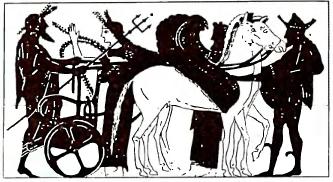Рис. 2. Посейдон на колеснице. Рисунок XIX века, сделанный с античной вазы Семьюдесятью сантиметрами выше захоронен кроманьонец ростом 194 сантиметра, среднего возраста. Руки его были согнуты в локтях и покоились на груди, он лежал ногами к входу в грот. На его груди и на поясе обнаружены остатки украшений из раковин, на голове – убор из просверленных раковин и зубов оленя. У головы – обломок рога оленя, украшенного резьбой. Еще выше обнаружен скелет женщины ростом 154 сантиметра. И в некоторых других местах находят «богов» ростом около двух метров, а рядом с ними – женщин «современного» роста – около метра шестидесяти. Автор назвал грот Гримальди могилой Посейдона. Великан-кроманьонец около двух метров ростом вполне мог быть местным Посейдоном, а женщина, лежащая в том же погребении, – здешней Клейто. Подросток – их сын. Все это очень похоже на ситуацию, о которой говорит Платон. Отметим еще, что костяки окрашивали краской и в Чатал-Гююке, но там людей хоронили уже под специальными глиняными платформами, окрашенными в красный цвет. Отсюда, как мне кажется, древнее сочетание: «смерть чермная», то есть «смерть красная». Поздняя народная этимология испортила одно из слов языка богов-кроманьонцев, получилось: «смерть черная». Выражение это уже лишено смысла в применении к смерти вообще, ибо черной смертью чаще всего называли смерть от чумы. Красный цвет – цвет смерти богов, цвет огня, который использовался позднее для погребального сожжения. Об этом мы найдем упоминания в скандинавских сагах (вспомним; что, согласно Допелли, город скандинавских богов Асгард имел отношение к Атлантиде). Теперь, думается, читатель может верить Платону. В его сочинениях рассказывается о быте, нравах, государственном устройстве земель атлантов. Вместе с тем кое-что верно и для Европы. «Произведя на свет пять раз по чете близнецов мужского пола, Посейдон взрастил их и поделил весь остров Атлантиду на десять частей, причем тому из старшей четы, кто родился первым, он отдал дом матери и окрестные владения, как наибольшую и наилучшую долю, и поставил его царем над остальными, а этих остальных сделал архонтами, каждому из которых он дал власть над многолюдным народом и обширной страной. Имена же всем он дал вот какие: старшему и царю – то имя, по которому названы и остров, и море, что именуется Атлантическим, ибо имя того, кто первым получил тогда царство, было Атлант. Близнецу, родившемуся вслед за ним и получившему в удел окраинные земли острова со стороны Геракловых столпов вплоть до нынешней страны гадиритов, называемой по тому уделу, было дано имя, которое можно было бы передать по-эллински как Евмел, а на туземном наречии – как Гадир. Из второй четы близнецов он одного назвал Амфереем, а другого – Евэмопом, из третьей – старшего Мне-сеем, а младшего – Автохтоном, из четвертой – Еласиппом старшего и Мнестором младшего и, наконец, из пятой четы старшего он нарек Азаэс, а младшего – Диапреп. Все они и их потомки жили там, властвуя над многими другими островами этого моря, и, как уже было сказано ранее, власть их простиралась по эту сторону Геракловых столпов, вплоть до Египта и Тиррении». Из этих строк явствует, что Египет и нынешняя Италия (Тиррения) были колониями атлантов. Это дает нам право взглянуть на грот Гримальди по-новому. Кроманьонец, захороненный там, вер