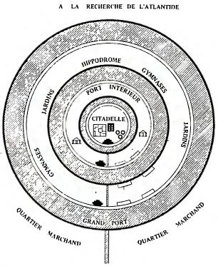 Рис. 4. План древней метрополии Атлантиды На острове били два источника – холодный и горячий, сообщает Платон. Вода их обладала целительной силой. Источники обвели стенами, насадили подле деревья. Были купальни с теплой водой – зимние, отдельно для царей, отдельно для простых людей, отдельно для женщин и отдельно для коней. Водовод поил священную рощу Посейдона, где росли высокие деревья небывалой красоты. На внешних кольцах атланты соорудили святилища, разбили сады и парки, построили гимнасии для упражнений, ипподром, помещения для царских копьеносцев: верные копьеносцы были размещены на меньшем кольце, ближе к акрополю, а самым верным из них были отданы помещения акрополя. От моря начиналась стена, которая отстояла от большого водного кольца (и от гавани) на пятьдесят стадиев. Она смыкалась около канала, входившего в море. Пространство возле нее было застроено, а канал гавани и сама гавань были заполнены кораблями. «…Весь этот край, – пишет Платон, – лежал очень высоко и круто обрывался к морю. Но вся равнина, окружавшая город и сама окруженная горами, которые тянулись до самого моря, являла собой ровную гладь; в длину она имела три тысячи стадиев, а в направлении от моря к середине – две тысячи. Вся эта часть острова была обращена к южному ветру, а с севера закрыта горами. Эти горы восхваляются преданием за то, что они по множеству, величине и красоте превосходили все нынешние: там было большое количество многолюдных селений, были реки, озера и луга, доставлявшие пропитание всем родам ручных и диких животных, а равно и леса, огромные и разнообразные, в изобилии доставлявшие дерево для любого дела. Такова была упомянутая равнина от природы, а над устроением ее потрудилось много царей на протяжении многих поколений. Она являла собой продолговатый четырехугольник, по большей части прямолинейный, а там, где его форма нарушалась, ее выправили, окопав со всех сторон каналом. Если сказать, каковы были глубина, ширина и длина этого канала, никто не поверит, что возможно было такое творение рук человеческих, выполненное впридачу к другим работам, но мы обязаны передать то, что слышали: он был прорыт в глубину на плетр, ширина на всем протяжении имела стадий, длина же по периметру вокруг всей равнины была десять тысяч стадиев. Принимая в себя потоки, стекавшие с гор, и огибая равнину, через которую он в различных местах соединялся с городом, канал изливался в море. Выше по течению от него были прорыты прямые каналы, которые шли по равнине и затем снова стекали в канал, шедший к морю, причем они отстояли друг от друга на сто стадиев. Они соединялись между собой и с городом протоками, по ним переправляли к городу лес с гор и разнообразные плоды. Урожай снимали по два раза в год, зимой получая орошение от Зевса, а летом отводя из каналов воды, источаемые землей». Платон рассказывает и о военной организации атлантов. Численность армии атлантов превосходит, по-видимому, все, что известно седой древности. «…Каждый участок равнины должен был поставлять одного воина-предводителя, причем величина каждого участка была десять на десять стадиев, а всего участков насчитывалось шестьдесять тысяч; а то несчетное число простых ратников, которое набиралось из гор и из остальной страны, сообразно числу участков распределялось между предводителями. В случае во